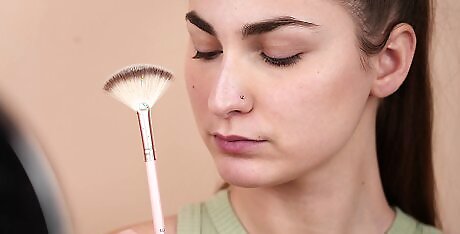 Get rid of a shiny T-zone using a large fan brush. If you have oily skin, dip your fan brush into a translucent powder. Brush the powder along any shiny spots on your face, including your forehead, nose, and chin. The fan brush will give you even, blended coverage. You can tap your brush against the translucent powder's container before applying it to your skin to get rid of any excess.
