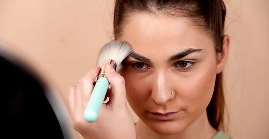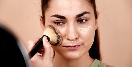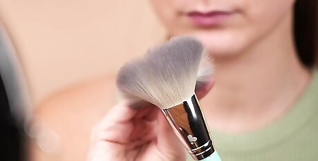 Create an airbrushed effect by fan brushing foundation. Use a large fan brush to even out your powdered foundation, using the top of the brush to gently buff the foundation on your entire face. This will leave you with a streak-free complexion.