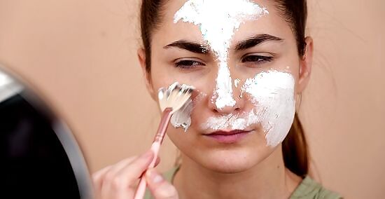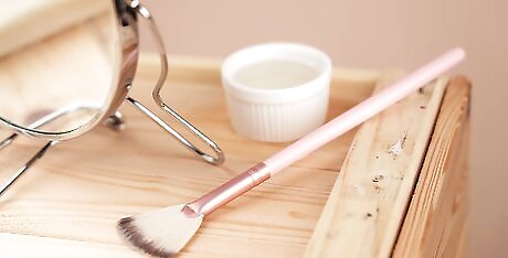 Use a fan brush to apply a facial mask. Dip a medium-sized fan brush into your facial mask so that there's a quarter-sized amount on the brush. Start spreading the mask over your face using the flat side of the brush. This will give you thin, even coverage without wasting any of the mask. If you didn't apply enough of the facial mask to your brush the first time, add another quarter-sized dollop and keep going.