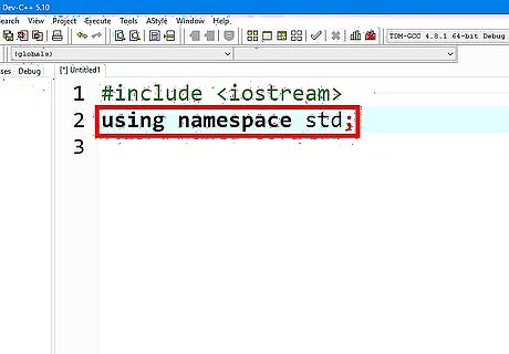 Use standard namespace. In addition to preprocessor directives, the first lines of the code must also define the namespace being used. The standard namespace, formatted as shown below, is sufficient for this code. Note that this line ends with a semicolon.