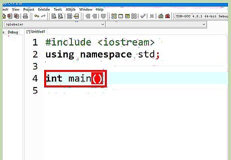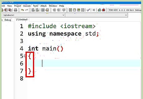 Make curly braces immediately following the function. On the next line, make a set of curly braces as shown in the graphic. Everything included within these curly brackets is part of the main function. The code up to this point should look something like the picture below.