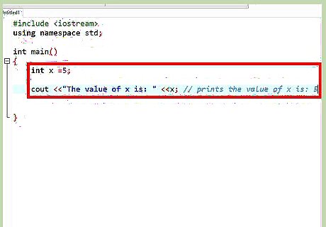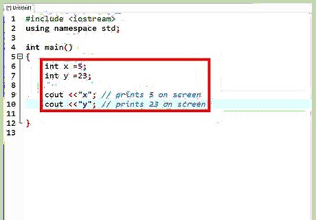 Become familiar with other uses of cout. Cout can also be used to output the values of variables, as long the variable has already been defined. Simply write the name of the variable after the insertion operator as shown below.