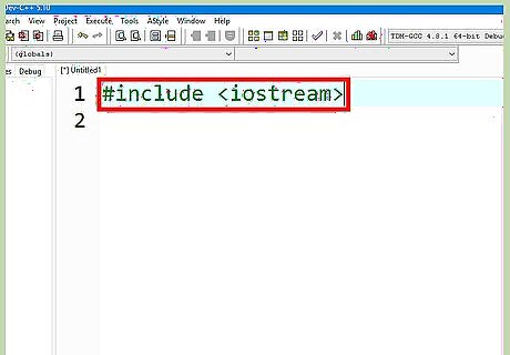 Include preprocessor directives. These are the first lines of code in the program and are preceded by a hash sign. They are needed for the program to properly compile. In this case the only preprocessor directive needed is iostream, formatted as shown below. Notice that there is no semicolon used at the end of this statement.
