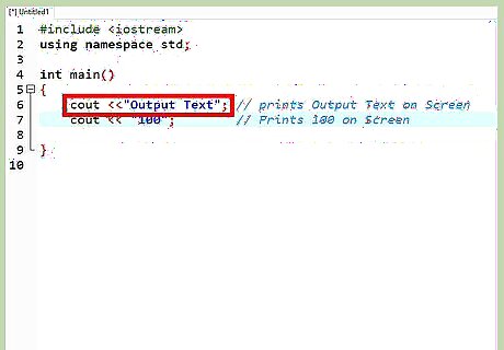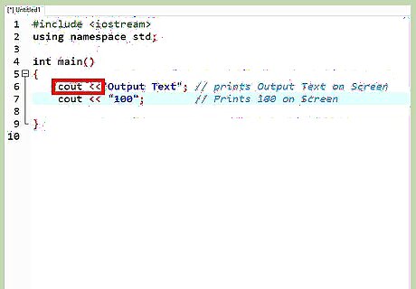 Know the syntax. Cout is used with the insertion operator, which is written as << (two “less than” signs). The actual output then follows, written within quotation marks. The line must end with a semicolon.