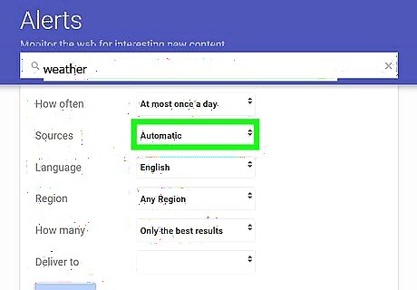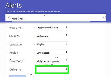 Select your email or RSS feed next to "Deliver to." If you want to get an email of the Google Alert results, make sure you have your email selected. Select "RSS feed" if you can import it to an RSS feed reader. Otherwise, you won't be able to read the search results.