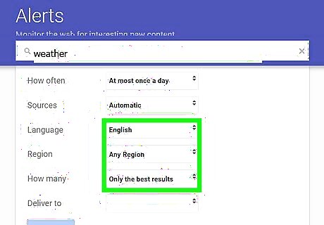 Edit the "How many," "Language," and "Region" settings. You can filter results based on your location by using the "Region" drop-down as well as in what language you get the results. "How many" often defaults to "Only the best results" so your inbox doesn't get overwhelmed with search results.