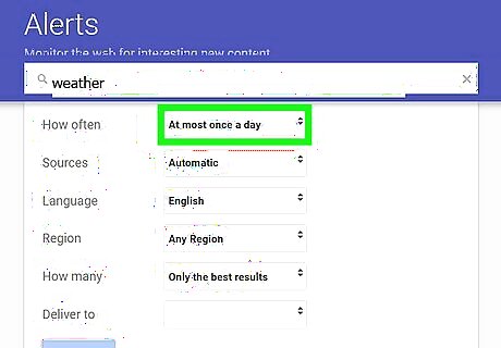 Change the frequency. Indicate how often you would like the results to be delivered to your inbox. You have the options of once a week, once a day, or as-it-happens. The as-it-happens setting may deliver the results to your inbox multiple times a day, depending on how often the query appears in the news stream. If this is likely to be annoying, don't choose that option. Choosing to receive notifications once a day and once a week will stockpile the results and only deliver them on your schedule. The default for this option is once a day.