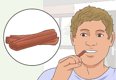 Chew on cinnamon. Cinnamon sticks can release essential oils that kill bacteria that cause bad breath odors. It also has a good taste! To use cinnamon as a rinse, add a teaspoon of it to a cup of water and boil for five to ten minutes. Strain the solution and rinse your mouth. Repeat twice a day.