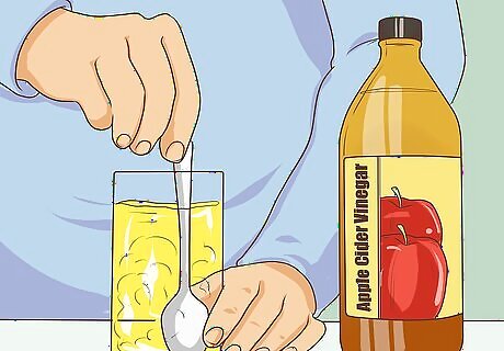 Try apple cider vinegar. Apple cider vinegar has acidic and antiseptic properties which break down plaque and can fight the bacteria in your mouth that causes bad breath. Stir a teaspoon of apple cider vinegar in a glass of water and drink before each meal. Alternatively, you could drink a diluted tablespoon of diluted vinegar after each meal. To use as a rinse, stir a teaspoon of the vinegar in cup of warm water and gargle.