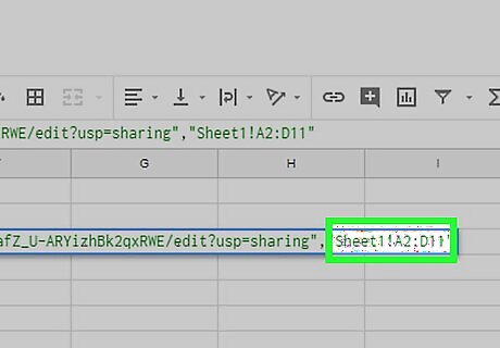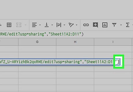 Type ). You should now see something like this: =IMPORTRANGE(“https://docs.google.com/spreadsheets/test” , “Sheet1!A2:D11”).