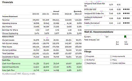 Click on "Financial Statements" along the left side of that page. This takes you to the "10-Yr Income" tab. For an interesting long-term view, the "5-Yr Restated" page is helpful. Click on the fourth tab over above the bar graph which is the "5-Yr Restated" financials page.