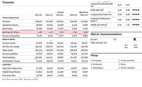 Look at earnings, the fifth line down. Again, what you are looking for will determine the value of the stock.