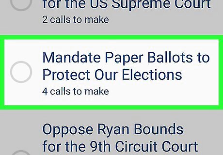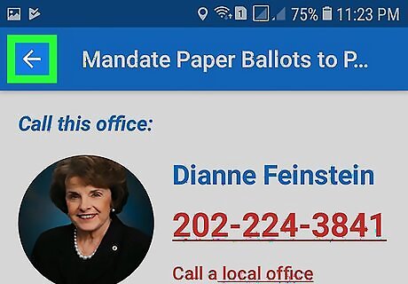 Tap Android 7 Arrow Back to call the next Congress member or select another issue. After you finish calling all your representatives for an issue, tap the back button to return to the issue list. Tap another issue to select it, and then start making phone calls. You can make as many phone calls as you wish.