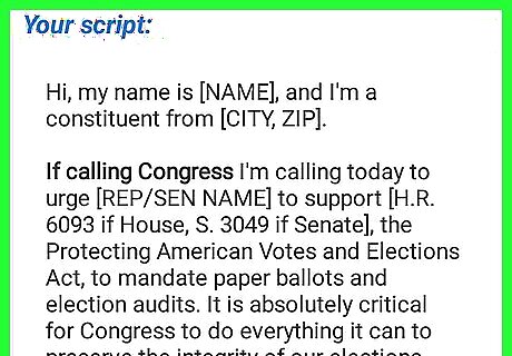 Read the script or say what you feel. Keep your call short, preferably under a minute in length. Regardless of how you feel about the issue, remember that the person answering the phone is just a staff member doing their job. If you reach the congress member’s voicemail, leave a message. Include your home address so your congress member knows you live in a district he or she represents. If the line is busy, tap Call a local office above the script, then tap the alternate phone number. This places a call to the senator or representative's local office instead.