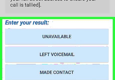 Select a result after the call is finished. Your options are at the bottom of the script screen. After logging your result, you’ll see the name and contact information for the next person you need to call (if applicable). Tap Made Contact if someone answered the phone and spoke to you. Tap Unavailable if nobody answered and you couldn’t leave a message. Tap Left Voicemail if you were able to leave a message.