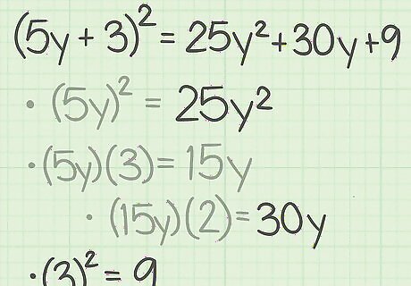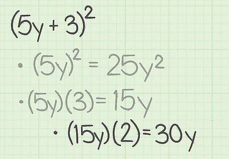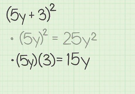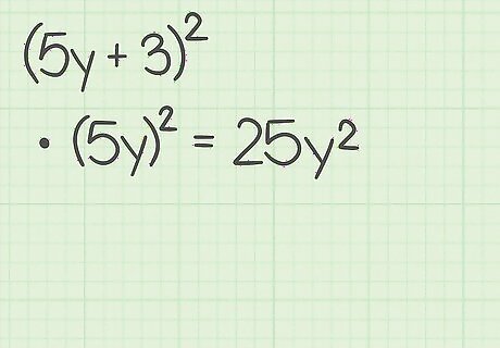 Square the first term of the binomial. This will become the first term of the trinomial. Remember that squaring a term means to multiply it by itself. For example, if you are expanding ( 5 y + 3 ) 2 {\displaystyle (5y+3)^{2}} (5y+3)^{{2}}, you would first calculate ( 5 y ) 2 = 25 y 2 {\displaystyle (5y)^{2}=25y^{2}} (5y)^{{2}}=25y^{{2}}. So, 25 y 2 {\displaystyle 25y^{2}} 25y^{{2}} is the first term of the trinomial.