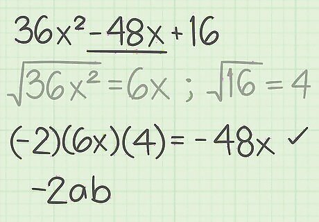 Determine whether the middle term follows the formula 2 a b {\displaystyle 2ab} 2ab or − 2 a b {\displaystyle -2ab} -2ab. That is, if you multiply the square roots of the first and last term of the trinomial, and then multiply that product by 2 or -2, the result will equal the middle term of the trinomial, if the trinomial is a perfect square. For example, if a = 6 x {\displaystyle a=6x} a=6x and b = 4 {\displaystyle b=4} b=4, then the middle term of the trinomial should follow the formula ( − 2 ) ( 6 x ) ( 4 ) {\displaystyle (-2)(6x)(4)} (-2)(6x)(4). Since ( − 2 ) ( 6 x ) ( 4 ) = − 48 x {\displaystyle (-2)(6x)(4)=-48x} (-2)(6x)(4)=-48x the middle term of the trinomial does follow the perfect square formula. Since the first and last terms of the trinomial followed the formula as well, you know that your trinomial is a perfect square.