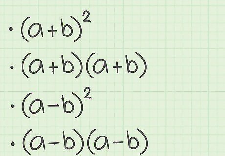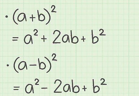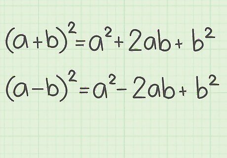 Set up the formula for a perfect square trinomial. The formula is ( a + b ) 2 = a 2 + 2 a b + b 2 {\displaystyle (a+b)^{2}=a^{2}+2ab+b^{2}} (a+b)^{{2}}=a^{{2}}+2ab+b^{{2}}. If the binomials show subtraction, the formula is ( a − b ) 2 = a 2 − 2 a b + b 2 {\displaystyle (a-b)^{2}=a^{2}-2ab+b^{2}} (a-b)^{{2}}=a^{{2}}-2ab+b^{{2}}. Note that a {\displaystyle a} a is the first term of the binomial, and b {\displaystyle b} b is the second term of the binomial.