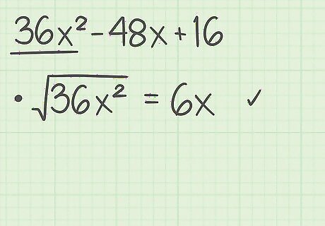 Determine whether the first term in the trinomial is a perfect square. A perfect square is a number whose square root is a whole number. Since the first term in the perfect square formula is a 2 {\displaystyle a^{2}} a^{{2}}, the first term in your trinomial must be a perfect square. Note that the square root of the first term is equal to a {\displaystyle a} a in the squared binomial. For example, in the trinomial 36 x 2 − 48 x + 16 {\displaystyle 36x^{2}-48x+16} 36x^{{2}}-48x+16, the first term is 36 x 2 {\displaystyle 36x^{2}} 36x^{{2}}. The square root of 36 x 2 {\displaystyle 36x^{2}} 36x^{{2}} is 6 x {\displaystyle 6x} 6x. So, the first term of this trinomial is a perfect square. Also, in the squared binomial, a = 6 x {\displaystyle a=6x} a=6x.