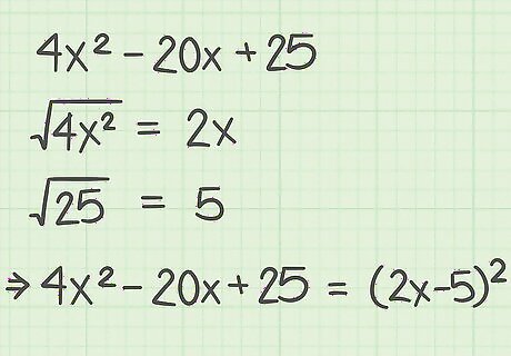 Factor the following trinomial. It factors into a squared binomial: 4 x 2 − 20 x + 25 {\displaystyle 4x^{2}-20x+25} 4x^{{2}}-20x+25. Since you know this factors into a squared binomial ( ( a − b ) 2 {\displaystyle (a-b)^{2}} (a-b)^{{2}}), you know that it follows the perfect square formula. Find the a {\displaystyle a} a term of the binomial, which is equal to the square root of the first term of the trinomial: 4 x 2 = 2 x {\displaystyle {\sqrt {4x^{2}}}=2x} {\sqrt {4x^{{2}}}}=2x. Find the b {\displaystyle b} b of the binomial, which is equal to the square root of the last term of the trinomial: 25 = 5 {\displaystyle {\sqrt {25}}=5} {\sqrt {25}}=5. Write the squared binomial. Since the second term of the trinomial is negative, you know that the second term of the binomial will also be negative: 4 x 2 − 20 x + 25 = ( 2 x − 5 ) 2 {\displaystyle 4x^{2}-20x+25=(2x-5)^{2}} 4x^{{2}}-20x+25=(2x-5)^{{2}}