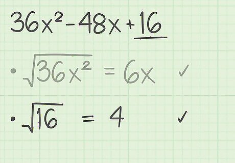 Determine whether the last term of the trinomial is a perfect square. Since the last term in the perfect square formula is b 2 {\displaystyle b^{2}} b^{{2}}, the last term in your trinomial must be a perfect square. Note that the square root of the last term is equal to b {\displaystyle b} b in the squared binomial. For example, in the trinomial 36 x 2 − 48 x + 16 {\displaystyle 36x^{2}-48x+16} 36x^{{2}}-48x+16, the last term is 16 {\displaystyle 16} 16. The square root of 16 {\displaystyle 16} 16 is 4 {\displaystyle 4} 4. So, the last term of this trinomial is a perfect square. Also, in the squared binomial, b = 4 {\displaystyle b=4} b=4