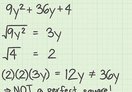 Consider the following trinomial. Determine whether it is a perfect square: 9 y 2 + 36 y + 4 {\displaystyle 9y^{2}+36y+4} 9y^{{2}}+36y+4. Recall the formula for a perfect square trinomial: ( a + b ) 2 = a 2 + 2 a b + b 2 {\displaystyle (a+b)^{2}=a^{2}+2ab+b^{2}} (a+b)^{{2}}=a^{{2}}+2ab+b^{{2}}. Determine whether the first term of the trinomial is a perfect square: 9 y 2 = 3 y {\displaystyle {\sqrt {9y^{2}}}=3y} {\sqrt {9y^{{2}}}}=3y. So, a = 3 y {\displaystyle a=3y} a=3y. Determine whether the last term of the trinomial is a perfect square: 4 = 2 {\displaystyle {\sqrt {4}}=2} {\sqrt {4}}=2. So, b = 2 {\displaystyle b=2} b=2. Determine whether the middle term of the trinomial follows the formula 2 a b {\displaystyle 2ab} 2ab: 36 y = ( 2 ) ( 3 y ) ( 2 ) {\displaystyle 36y=(2)(3y)(2)} 36y=(2)(3y)(2) 36 y = 12 y {\displaystyle 36y=12y} 36y=12ySince this is not true, the middle term does not follow the formula, and therefore the trinomial is not a perfect square.