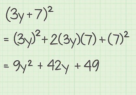 Expand the following expression. Use the perfect square identity rather than the FOIL method: ( 3 y + 7 ) 2 {\displaystyle (3y+7)^{2}} (3y+7)^{{2}}. Set up the formula ( a + b ) 2 = a 2 + 2 a b + b 2 {\displaystyle (a+b)^{2}=a^{2}+2ab+b^{2}} (a+b)^{{2}}=a^{{2}}+2ab+b^{{2}} and plug in the a {\displaystyle a} a and b {\displaystyle b} b values: ( 3 y + 7 ) 2 = ( 3 y ) 2 + 2 ( 3 y ) ( 7 ) + 7 2 {\displaystyle (3y+7)^{2}=(3y)^{2}+2(3y)(7)+7^{2}} (3y+7)^{{2}}=(3y)^{{2}}+2(3y)(7)+7^{{2}}. Square the first term: 9 y 2 + 2 ( 3 y ) ( 7 ) + 7 2 {\displaystyle 9y^{2}+2(3y)(7)+7^{2}} 9y^{{2}}+2(3y)(7)+7^{{2}}. Multiply the first and last term, and multiply the product by 2: 9 y 2 + 42 y + 7 2 {\displaystyle 9y^{2}+42y+7^{2}} 9y^{{2}}+42y+7^{{2}}. Square the last term: 9 y 2 + 42 y + 49 {\displaystyle 9y^{2}+42y+49} 9y^{{2}}+42y+49.