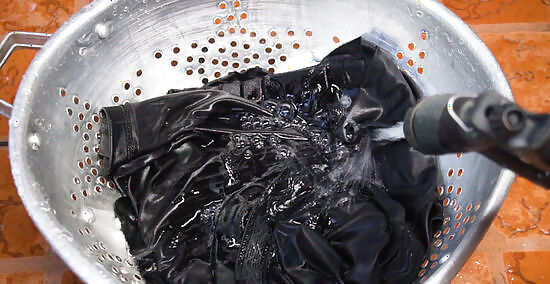 Squeeze the sleeves gently to remove excess water. Don’t twist or wring out the material, as this can damage the fibers of the fabric and stretch it out. You can even use a dry towel and fold the sleeves up in it to absorb excess water. It can take sleeves a long time to dry, so getting as much water out of them after washing will help speed up that drying time. Don’t put sleeves into the dryer or into the sun—heat can shrink and damage the latex.
