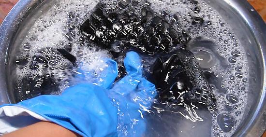 Soak the knee sleeves in the cleaning solution. Use your fingers to work the water through the sleeves rather than using a scrub brush. A brush can easily damage fabrics, so use your hands to squeeze and soak the sleeves repeatedly to ensure they’re getting cleaned all the way through. Wear plastic gloves to protect your hands if you are sensitive to cleaning products. Pay special attention to the crease where your knee bends to fully remove dirt and bacteria.