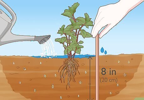 Soak soil to a depth of 8 in (20 cm) if you’re watering outdoor herbs. Use your garden hose with a shower head attachment or a watering can to water your herbs. Water the soil around the base of the herbs and avoid getting the leaves wet. Allow the water to form puddles and then let it soak into the ground. Poke the end of a stick into the soil to a depth of 8 inches (20 cm) to see if the soil feels damp. Watering to a depth of 8 inches (20 cm) ensures that all of the roots get enough nutrients.
