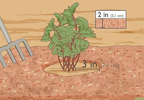 Add 2 in (5.1 cm) of mulch to herbs planted in the ground. Choose a wood mulch from your local gardening center and pour it on the soil around your herbs. Use a rake to spread the mulch into a 2 in (5.1 cm) layer on the surface. Leave about 3 inches (7.6 cm) of space between the mulch and the base of the herbs to help prevent rot. Mulching outdoor herbs also prevents weeds from growing and competing with your herbs. Continue checking the dampness of the soil daily since it can still dry out under the mulch.Tip: You do not need to use mulch for indoor or potted herbs.