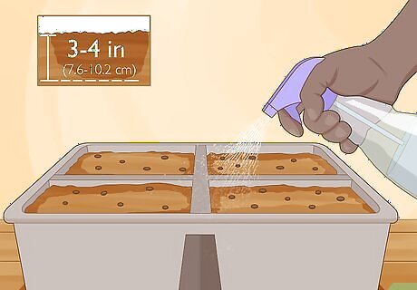 Moisten soil daily to a depth of 3 in (7.6 cm) for herb seeds. Use a spray bottle or a small watering can so you don’t disturb the seeds when you water them. Spray the soil until it feels damp 3–4 inches (7.6–10.2 cm) below the surface. Make sure the soil stays moist while the seeds germinate so they can get the nutrients they need to grow. Once the seedlings grow 4–5 inches (10–13 cm) tall, stop using the spray bottle to water them. Avoid using jet attachments for hoses to water seeds, or else you may wash the seeds out of the ground. Don’t allow seeds to dry out since they may not produce healthy plants otherwise.