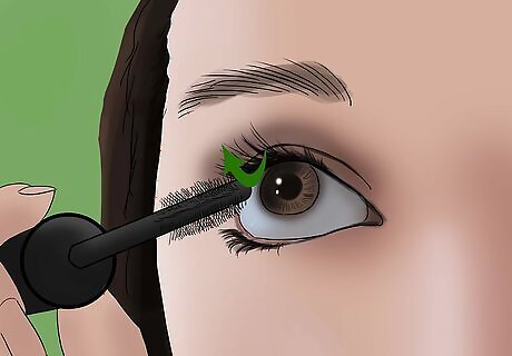 Add mascara. Bold eyeshadow can overpower your eyelashes, so it’s important to finish your eyes with mascara. This will help open your eye and make it look bright. Begin by holding your mascara wand at the base of your lashes. As you move it down the length of your lashes, wiggle it gently to avoid clumping. After one coat dries, feel free to add another for extra volume.