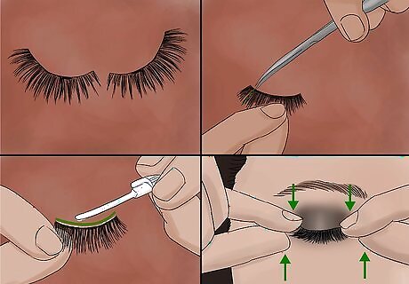 Pop on a pair of false lashes. If you want even more drama than mascara can provide, glue on a pair of false eyelashes. These are sure to make your bold eyeshadow even more eye-catching. You can purchase a pair of falsies from your local pharmacy or beauty supply store, and make sure to pick up some eyelash glue too, if not included. After trimming your false lashes to fit your eye, dot the glue along the band. Let the glue dry until it becomes tacky, and carefully press the lashes into your top waterline. Press and hold your false lashes into your waterline while pressing your fake and natural lashes together so they blend seamlessly.