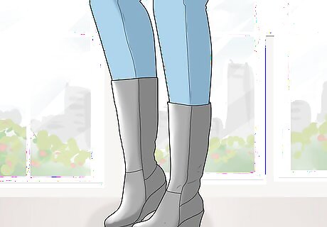 Tuck skinny blue jeans into your wedge boots for a casual look. Jeans and wedge boots make for a sleek line on your leg, which nicely complements bulkier looks with layered sweaters and scarves, and also works great with a tee-shirt or tank top. Straight jeans tuck in well too. Cuff your jeans if you want to expose more of the boot. If you have boot-cut jeans, just let them fall over the tops of your boots.