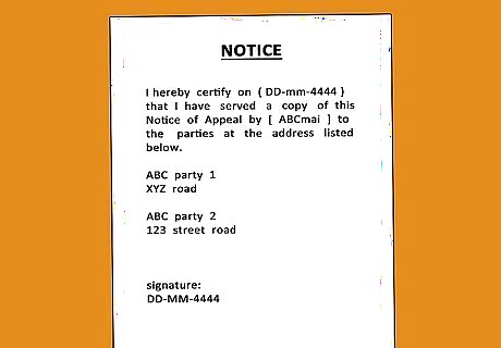 Append a Certificate of Service. You must serve the other parties in your lawsuit notice that you intend to appeal. You can do this by sending them copies of your completed Notice of Appeal. You must certify to the Court that you have notified them. You can give notice in several ways. For example, many courts allow for notice by mail. If you can serve notice by mail, type, "I hereby certify on [the date] that I have served a copy of this Notice of Appeal by [U.S. mail or another carrier] to the parties at the addresses listed below." Then list the parties, including their addresses, and sign and date the certification. If you choose to mail, be sure to send by certified mail. You may also hire a process server to deliver the notice, or deliver it yourself. In this case, type, "I hereby certify on [the date] that the attached Notice of Appeal was delivered by hand to the parties listed at the addresses below.” Then list the parties and their addresses, followed by your signature and the date.