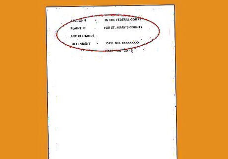 Copy the caption. The caption is the heading of a legal document. It lays out the parties, the case number, and the name of the court hearing the case. Almost every document that you file should have the same caption. Simply copy this information and format it into a new document. In some jurisdictions, you will use the name of the court which will hear the appeal instead of the name of the court that heard the trial. Check with your appellate rules.