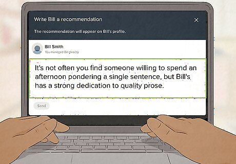 Think of a great starting line. Employers read hundreds of profiles and cover letters each day. Starting with something generic ("Bill is a hard worker.") will not make someone stop to read. Think of an attention-grabbing line that will stand out from the pack while someone is working through profiles. Remember, you're trying to make employers stop and think, "This is the best person for the job." Think of your favorite quality about the person and a creative way to convey that. For example, do not say, "Bill is a great writer." Instead, say something like, "It's not often you find someone willing to spend an afternoon pondering a single sentence, but Bill's has a strong dedication to quality prose."
