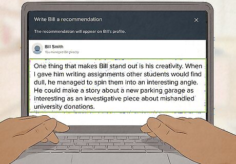 Focus on one outstanding trait. Remember to be short and to the point. After giving a list of some general qualities, zero in on one outstanding trait. This will help ground the recommendation. An employer may be bombarded if you try to include everything in a single recommendation, so think about a single trait that really makes this person stand out. What do you most admire about your contact? For example, "One thing that makes Bill stand out is his creativity. When I gave him writing assignments other students would find dull, he managed to spin them into an interesting angle. He could make a story about a new parking garage as interesting as an investigative piece about mishandled university donations."
