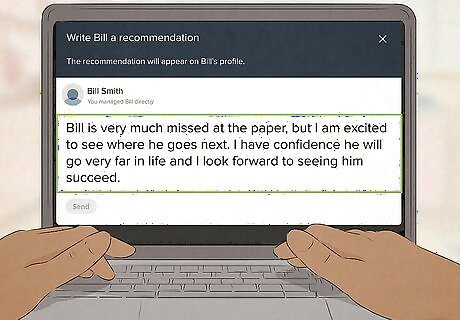 End on a personal note. In closing your recommendation, say something personal. Talk about how you remember working with the person and reflect on your hopes for their future. For example, say something like, "Bill is very much missed at the paper, but I am excited to see where he goes next. I have confidence he will go very far in life and I look forward to seeing him succeed."