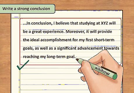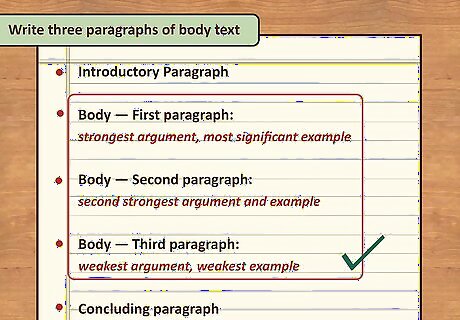 Write three paragraphs of body text. The body text should support the argument outlined in your thesis statement. Following your introductory paragraph with three paragraphs of body text, and then a conclusion, allows you to follow the classic format for a five-paragraph essay. Each paragraph of the body text section should contain a different argument/evidence that supports your thesis. The first body text paragraph should feature your strongest arguments. Each paragraph of body text should be between three and five sentences long. Throughout your body text, be sure to offer examples and anecdotes that boost your arguments. For instance, if your thesis is “ambition is the most important characteristic of leadership,” give examples of how you or strong leaders throughout history have embodied this trait. Use the information you gathered during your research when writing your body text. If the essay application defines different requirements for your essay, such as longer or shorter, follow those instead of the five-paragraph model.