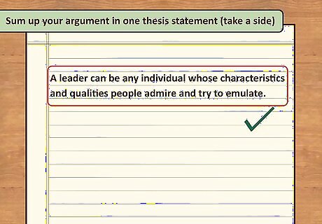 Sum up your argument in one thesis statement. Explain what it is about leadership that you will be writing about. Your thesis statement should appear in the introductory paragraph of your essay, usually as the last sentence. If the application asks a direct question about leadership, you will need to answer it. That will form the basis of how you craft your thesis statement. A thesis statement should be debatable; you should take a side. An example would be, “A leader can be any individual whose characteristics and qualities people admire and try to emulate.” Some examples of strong thesis statements are: “The most important trait for a leader is ambition;” “All strong leaders are good communicators;” and “Every great leader has overcome failure in his or her life.” The rest of your essay should offer supporting evidence for the argument(s) you make in your thesis statement.