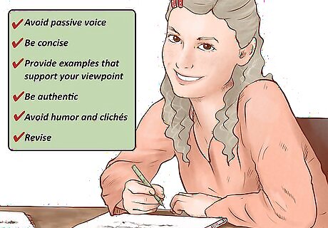 Remember the “intangibles” that make an essay great. In addition to answering the questions posed and meeting the requirements of the application, you can create a great essay by incorporating some characteristics of good writing. Active voice verbs are better than passive ones. Your text will be more compelling if you focus on this simple task. Be concise. If you can say something in a sentence rather than a paragraph, write it that way. Specific examples that support your viewpoint are better than general statements. Make sure your essay really represents you and your thoughts. By maintaining your individuality throughout the writing process, you will be able to bring your own unique perspective to the essay, setting it apart from all of the others.