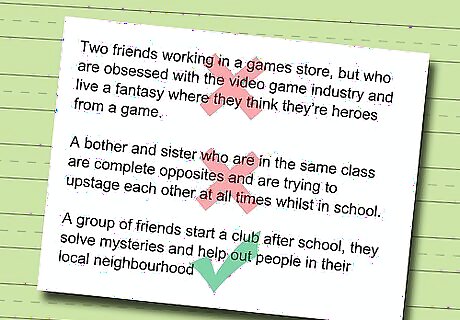 Eliminate some ideas. You should eliminate some of your weaker ideas or ones that couldn't be elaborated on very well. You should narrow your list down to about 4-7 workable ideas. Act some out if you need to. Do what you need to do to determine if an idea is workable or not. If that means acting a scenario out, then by all means do it. The final goal is to get a few great ideas.