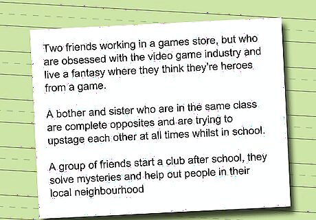 Brainstorm. You will need to try to come up with as many ideas or situations as you can. Try to think of some typical situations, as well as some wacky ones. It is good to have a variety to work with. Be sure to not worry about the content of the ideas. At this point, you just need to get a basis for an idea, then run with it later on. Make a plan beforehand. Prior to starting you brainstorm session, know or jot down who your characters are and know their defining traits. This will make the brainstorming easier.