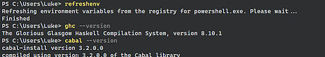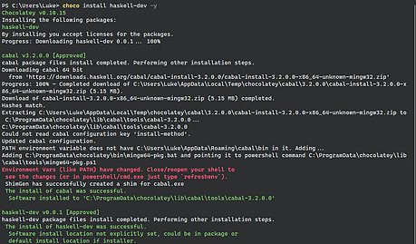 Install the Haskell tools. As noted on Haskell's website, you must install the haskell-dev package via Chocolatey. Before running choco make sure you've either restarted Windows Terminal or ran the commandrefreshenv so that choco will be in the $Env:Path. Using an elevated prompt, run the following command choco install haskell-dev -y
