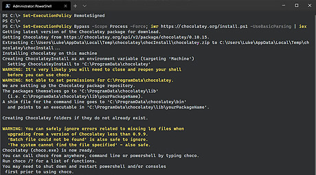 Enter the commands below in sequential order. For reference, I have shown an example in the photo above.Set-ExecutionPolicy RemoteSigned Set-ExecutionPolicy Bypass -Scope Process -Force; iwr https://chocolatey.org/install.ps1 -UseBasicParsing | iex