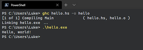 Compile the program. Congratulations, you just wrote your first haskell program. All you have to do now is compile it. Open up Windows Terminal and navigate to the folder where you saved your hello.hs file. You can use the context menu option "Open Here" if you selected that option when install Powershell 7. Once there, you can begin the compilation process using the following command: ghc hello.hs -o hello The compile takes the source code hello.hs as input using the -o flag you can pass the name of what you want the output executable to be. In this case it's hello To run the program after run .\hello.exe note: It is important to have the .\ in front of hello.exe