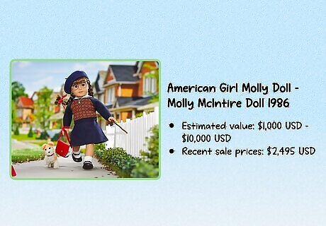 American Girl Molly Doll American Girl dolls were a big hit for collectors, and the Molly McIntire doll from 1986 is one of the most valuable. Molly represents a girl during World War II, and she became more popular through books and a movie featuring her. Now that the doll has been retired, her original release is worth a lot of money. Estimated value: $1,000–10,000 USD Recent sale prices: $2,495 USD