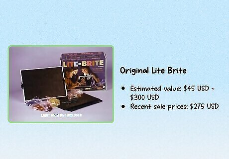 Original Lite Brite Lite Brite came with colored pegs you stuck into a board that lit up to display your design. Even though it may be a little tough to find a working one, a vintage Lite Brite from the '60s and '70s can give you a little extra pocket change. Estimated value: $ 45–300 USD Recent sale prices: $275 USD